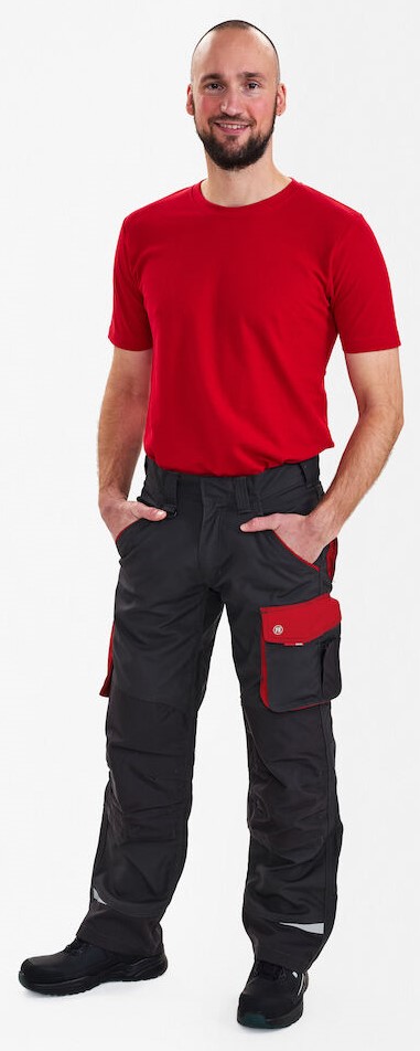 Funktionelle Arbeitshose mit vielen Details. Optimale Passform, u. a. sorgen ergonomisch geformte Knie und Panel an der Innennaht im Schritt für mehr Bequemlichkeit. Zwei geräumige, schräg sitzende Einschubtaschen vorne. Schlaufe mit D-Ring (vorne) zur Befestigung einer ID-Karte. Zwei geräumige Gesäßtaschen mit Patte und Klettverschluss. Schenkeltasche mit Reißverschlusstasche fürs Handy, zusätzliche kleine Tasche. Sie ist geräumig und sorgt dank des freihängenden Bodens für mehr Bewegungsfreiheit. Unten verstärkte Zollstocktasche mit zusätzlichen Fächern. Auch die Zollstocktasche hat einen freihängenden Boden. Knieverstärkung/Knietasche mit Klettverschluss unten sowie zwei Einstellmöglichkeiten für Knieschutzkissen. Verstärkter Saum der Hosenbeine hinten und vorne für extra hohe Verschleißfestigkeit. Reflexstreifen an den Knien und unten an den Hosenbeinen für mehr Sichtbarkeit. Für Industriewäsche geeignet.