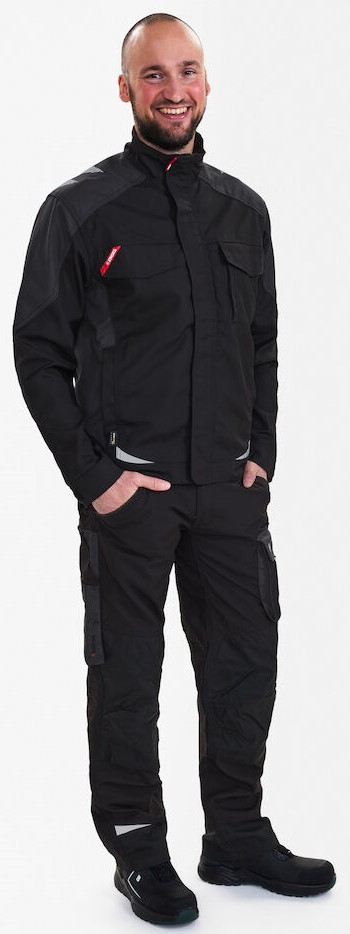 Funktionelle Arbeitsjacke mit vielen Details. Verlängerte Rückenpartie mit Bewegungsfalte. Verdeckter Reißverschluss vorn. Verstärkte Ellbogen. Zwei geräumige Einschubtaschen. Zwei Brusttaschen mit Patte – die rechte mit Schlaufe und D-Ring zur Befestigung einer ID-Karte, die linke mit zusätzlicher Reißverschlusstasche fürs Handy. Zwei große Innentaschen mit Klettverschluss. Verstellbare Ärmelbündchen. Reflexstreifen auf den Schultern sowie vorne und hinten für mehr Sichtbarkeit. Für Industriewäsche geeignet.