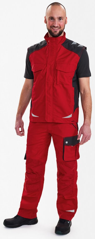Funktionelle Serviceweste mit vielen Details. Verlängerte Rückenpartie mit Bewegungsfalte. Verdeckter Reißverschluss vorn Zwei geräumige Einschubtaschen. Zwei Brusttasche mit Patte – die rechte mit Schlaufe und D-Ring zur Befestigung einer ID-Karte, die linke mit zusätzlicher Reißverschlusstasche fürs Handy. Zwei große Innentaschen mit Klettverschluss. Reflexstreifen auf den Schultern sowie vorne und hinten für mehr Sichtbarkeit. Für Industriewäsche geeignet.