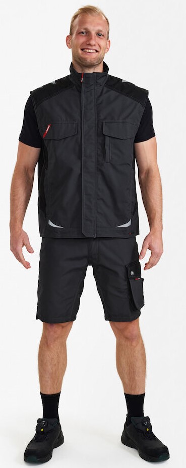 Funktionelle Serviceweste mit vielen Details. Verlängerte Rückenpartie mit Bewegungsfalte. Verdeckter Reißverschluss vorn Zwei geräumige Einschubtaschen. Zwei Brusttasche mit Patte – die rechte mit Schlaufe und D-Ring zur Befestigung einer ID-Karte, die linke mit zusätzlicher Reißverschlusstasche fürs Handy. Zwei große Innentaschen mit Klettverschluss. Reflexstreifen auf den Schultern sowie vorne und hinten für mehr Sichtbarkeit. Für Industriewäsche geeignet.