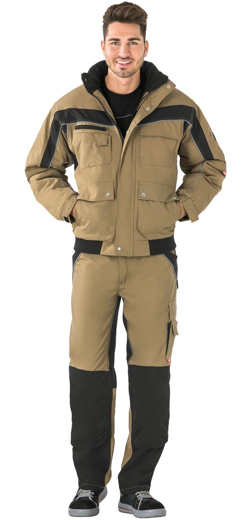 Atmungsaktiv, wasserdicht, Nähte hinterklebt, Fleecekragen, Reflexbiesen als Sicherheitsausstattung, Kapuze im Kragen, 1 Brusttasche links mit Patte und Klettverschluss, doppelte Brusttasche rechts, Handytasche auf der rechten Brust, 2 Stiftfächer, 2 seitliche Einschubtaschen, 2 aufgesetzte Seitentaschen, Ärmeltasche links, Dokumententasche unter der Frontpatte, Innenfutter gesteppt, verdeckter Frontreißverschluss, Strickbündchen am Bund, elastische Ärmelbündchen durch Klettband verstellbar.