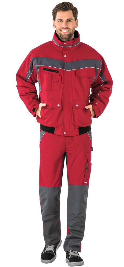 Atmungsaktiv, wasserdicht, Nähte hinterklebt, Fleecekragen, Reflexbiesen als Sicherheitsausstattung, Kapuze im Kragen, 1 Brusttasche links mit Patte und Klettverschluss, doppelte Brusttasche rechts, Handytasche auf der rechten Brust, 2 Stiftfächer, 2 seitliche Einschubtaschen, 2 aufgesetzte Seitentaschen, Ärmeltasche links, Dokumententasche unter der Frontpatte, Innenfutter gesteppt, verdeckter Frontreißverschluss, Strickbündchen am Bund, elastische Ärmelbündchen durch Klettband verstellbar.