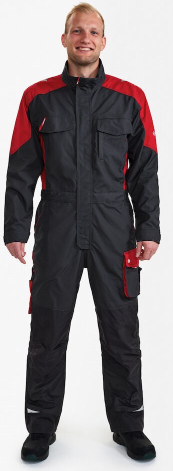 Funktionelle Overall mit vielen Details. Optimale Passform, u. a. sorgen ergonomisch geformte Knie, eine elastische Taille und Panel an der Innennaht im Schritt für mehr Bequemlichkeit. Verdeckter Reißverschluss vorn. Zwei Brusttasche mit Patte – die rechte mit Schlaufe und D-Ring zur Befestigung einer ID-Karte, die linke mit zusätzlicher Reißverschlusstasche fürs Handy. Verstellbare Ärmelbündchen. Zwei geräumige, schräg sitzende Einschubtaschen vorne. Zwei geräumige Gesäßtaschen mit Patte und Klettverschluss. Schenkeltasche mit Reißverschlusstasche und zusätzlicher kleiner Tasche. Sie ist geräumig und sorgt dank des freihängenden Bodens für mehr Bewegungsfreiheit. Unten verstärkte Zollstocktasche mit zusätzlichen Fächern. Auch die Zollstocktasche hat einen freihängenden Boden. Knieverstärkung/Knietasche mit Klettverschluss unten sowie zwei Einstellmöglichkeiten für Knieschutzkissen. Verstärkter Saum der Hosenbeine hinten sowie vorne und Verstärkung an den Ellenbogen für extra hohe Verschleißfestigkeit. Reflexstreifen an Schultern, Taille und Knien und unten an den Hosenbeinen für bessere Sichtbarkeit. Für Industriewäsche geeignet.