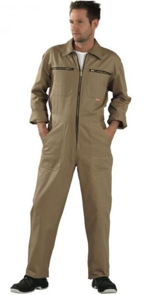 Umlegekragen, 2-Wege-Reißverschluss ca. 70 cm, 2 Brusttaschen, 2 aufgesetzte Seitentaschen, 1 Maßstabtasche, 2 Gesäßtaschen, 2 seitliche Durchgriffe, verstellbarer Gummizug im Rücken, verstellbare Fussweite an den Beinen, verstellbare Ärmelbündchen.
