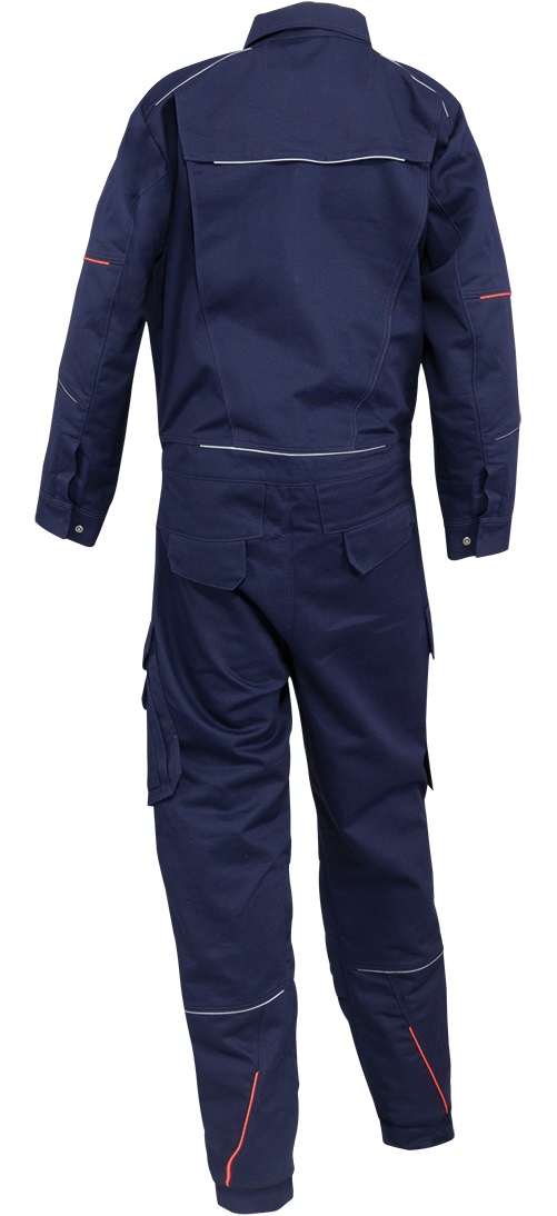 Ausführung: Umlegekragen, vordere Mitte mit Zwei-Wege-Reißverschluss, vordere Leiste mit Druckknöpfen, 2 Brusttaschen mit Patte und Druckknopf, Ärmelabschluss weitenverstellbar durch Druckknöpfe, Bund weitenverstellbar durch innenliegenden Gummizug, 2 Seitentaschen mit Patte und Druckknopf, links Cargotasche mit aufgesetzter Smartphonetasche jeweils mit Patte und Druckknöpfen, rechts Zollstocktasche mit Patte und Druckknopf, Knietaschen, Bewegungsfalten im Rückenteil, 2 Gesäßtaschen mit Patte und Druckknöpfen, links Brustinnentaschen mit Klett, Reflexpaspeln an Vorder-, Rückenteil, Schultern, Hosenbeinen und Ärmeln, leuchtfarbene Kontrastpaspeln an Ärmeln und Hinterhose, Proban®