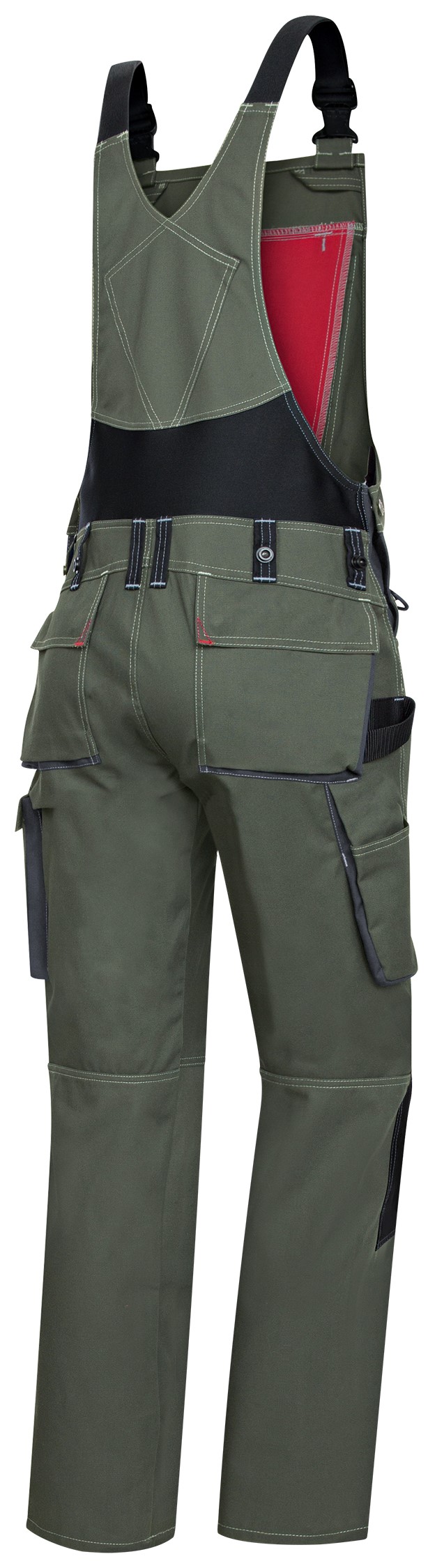 - Stretchträger mit Kunststoff-Steckschnallen, doppelte Latztasche mit Reißverschluss und Taschenklappe, 2 Stifttaschen, hochgezogener Rücken mit Stretcheinsatz für mehr Bewegungsfreiheit, regulierbare Bundweite