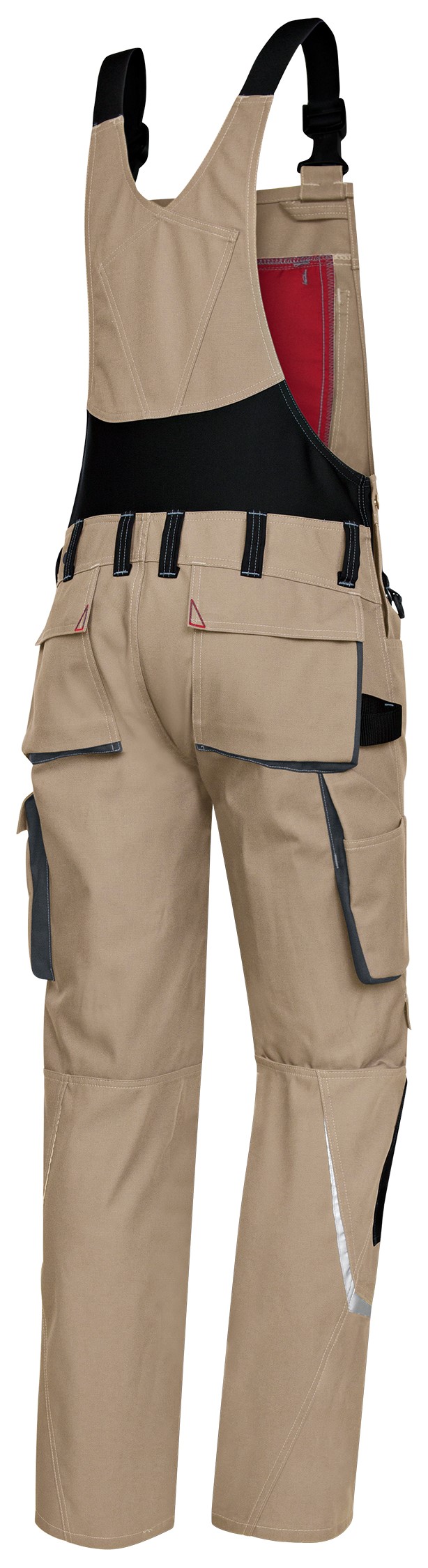 - Stretchträger mit Kunststoff-Steckschnallen, doppelte Latztasche mit Reißverschluss und Taschenklappe, 2 Stifttaschen, hochgezogener Rücken mit Stretcheinsatz für mehr Bewegungsfreiheit, regulierbare Bundweite