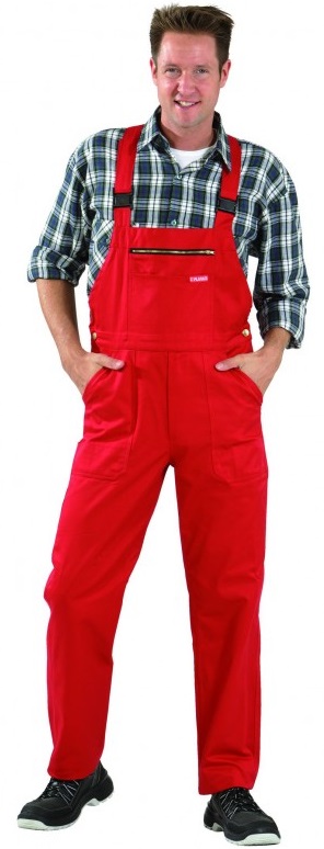 Brustlatz mit Messing-Reißverschluss, zusätzlich aufgesetzte Latztasche, 2 aufgesetzte Vordertaschen, verstärkt, 1 Gesäßtasche, 1 Maßstabtasche, Seitenschlitze verstellbar, Hosenschlitz mit Messing-Reißverschluss, hochgezogenes Rückenteil mit solide konstruiertem Zwischenteil, Sicherheitsschnallen an den Trägern.