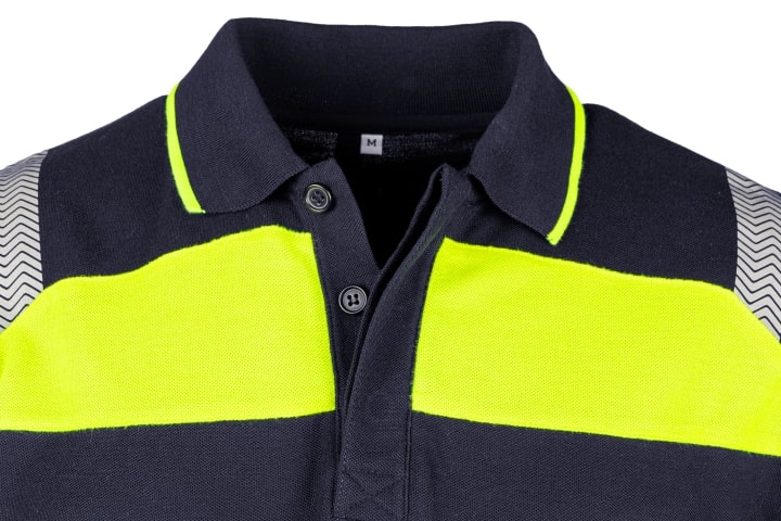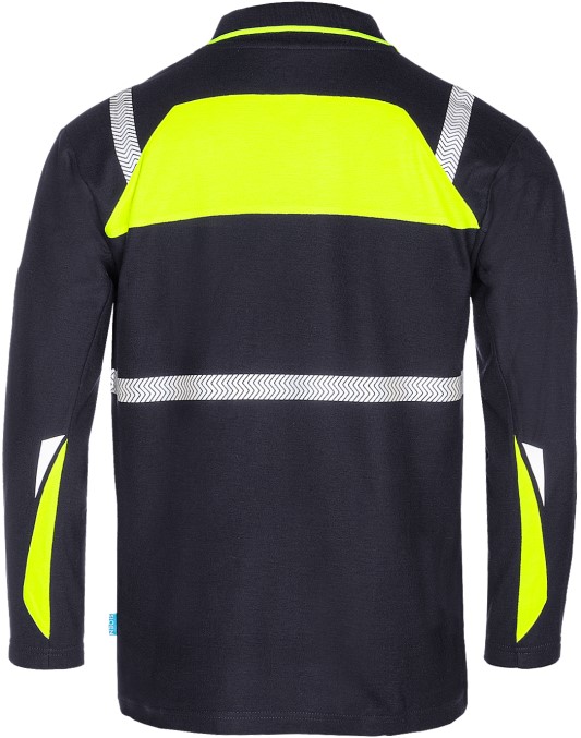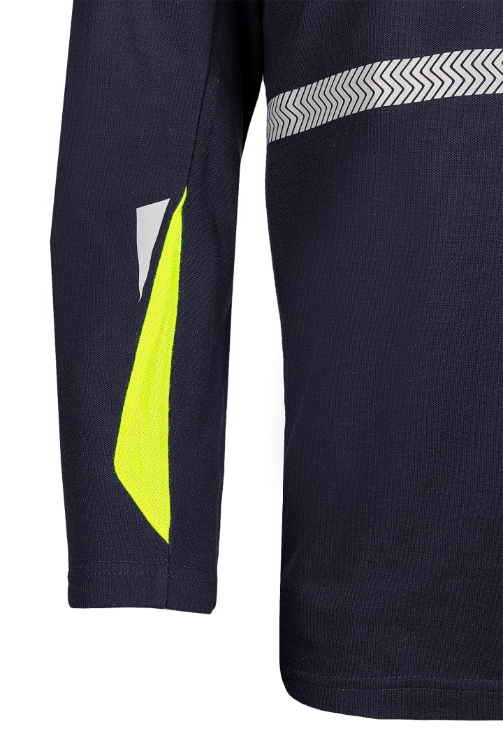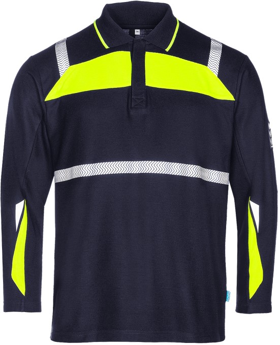 Telfs ist ein Multinorm-Poloshirt mit schmalen Streifen aus segmentiertem Reflexband. Der neue Stil dieses marineblauen Polos mit Akzenten aus fluoreszierendem gelb fällt besonders auf. Das Langarm-Poloshirt schützt Sie vor vielen Gefahren, da es verschiedenen internationalen Normen, darunter IEC 61482-2, EN ISO 11612, EN ISO 14116 und EN 1149-5, entspricht.