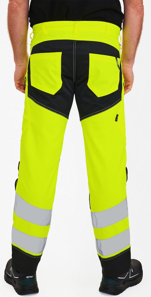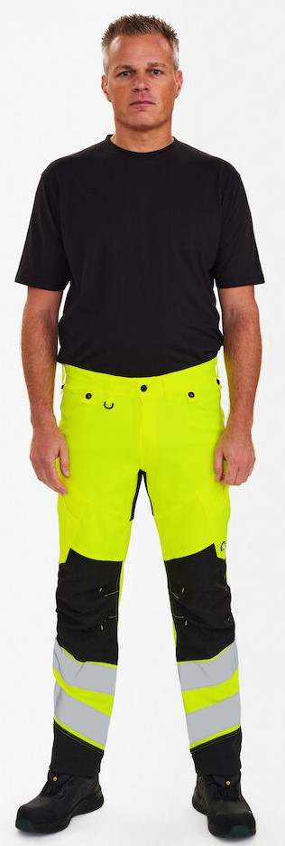 Dehnbare, funktionelle und fluoreszierende Hose im modernen Design. Optimale Passform mit u. a. ergonomisch geformtem Kniebereich. Der dehnbare Stoff sorgt für optimale Bewegungsfreiheit und Komfort. D-Ring vorne für die Befestigung von z. B. Ausweisen. Zwei geräumige Schrägtaschen vorne. Zwei Gesäßtaschen. Zwei Schenkeltaschen mit Reißverschluss. Die linke Schenkeltasche hat eine zusätzliche Handytasche. Die rechte Schenkeltasche hat eine aufgesetzte verstärkte Zollstocktasche mit zusätzlichen Unterteilungen. Knieverstärkung/Knietasche mit Klettverschluss unten und besteht aus CORDURA®-Material. Reflexstreifen am Unterschenkel. Breiter Saum unten, der ausgelassen werden kann, wenn zusätzliche Beinlänge erforderlich ist. Um die Hose zu verlängern, muss lediglich eine Naht aufgetrennt werden. Das Hosenbein ist trotzdem noch gesäumt. Bekleidungsklasse 2. Nach 50 mal Waschen getestet.