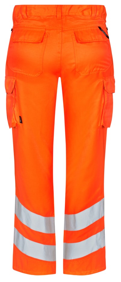 Funktionelle fluoreszierende Hose im modernen Design. Optimale Passform mit u. a. ergonomisch geformtem Kniebereich. Der Stoff ist strapazierfähig und atmungsaktiv und besteht zu 50% aus recyceltem Polyester. Der elastische Taillenbund hinten sorgt für eine gute Passform und einen sicheren Sitz der Hose. D-Ring vorne für die Befestigung von z. B. Ausweisen. Zwei geräumige Schrägtaschen vorne. Zwei Gesäßtaschen mit Patte und Klettverschluss. Zwei Schenkeltaschen mit Klettverschluss. Die linke Schenkeltasche hat eine zusätzliche Handytasche sowie eine Innentasche, z. B. für das Walkie-Talkie. Die rechte Schenkeltasche hat eine Innentasche für z. B. den Zollstock. Knieverstärkung/ Knietasche mit Klettverschluss unten und besteht aus CORDURA®-Material. Reflexstreifen am Unterschenkel. Bekleidungsklasse 2. Nach 50 mal Waschen getestet.