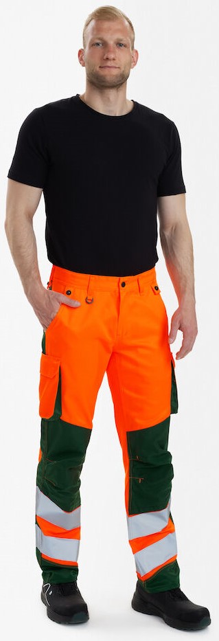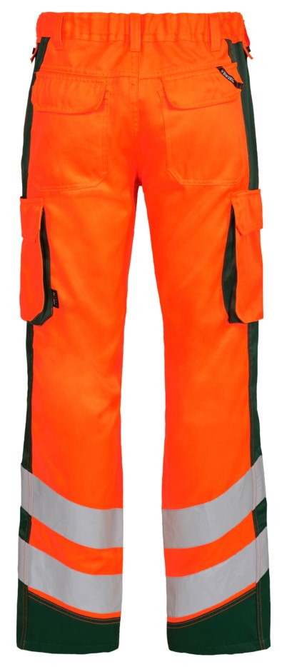 Funktionelle fluoreszierende Hose im modernen Design. Optimale Passform mit u. a. ergonomisch geformtem Kniebereich. Der Stoff ist strapazierfähig und atmungsaktiv und besteht zu 50% aus recyceltem Polyester. Der elastische Taillenbund hinten sorgt für eine gute Passform und einen sicheren Sitz der Hose. D-Ring vorne für die Befestigung von z. B. Ausweisen. Zwei geräumige Schrägtaschen vorne. Zwei Gesäßtaschen mit Patte und Klettverschluss. Zwei Schenkeltaschen mit Klettverschluss. Die linke Schenkeltasche hat eine zusätzliche Handytasche sowie eine Innentasche, z. B. für das Walkie-Talkie. Die rechte Schenkeltasche hat eine Innentasche für z. B. den Zollstock. Knieverstärkung/ Knietasche mit Klettverschluss unten und besteht aus CORDURA®-Material. Reflexstreifen am Unterschenkel. Bekleidungsklasse 2. Nach 50 mal Waschen getestet.