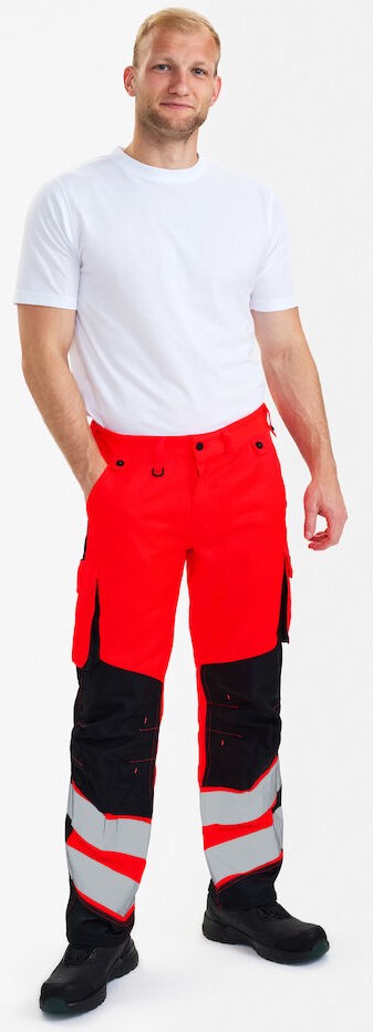 Funktionelle fluoreszierende Hose im modernen Design. Optimale Passform mit u. a. ergonomisch geformtem Kniebereich. Der Stoff ist strapazierfähig und atmungsaktiv und besteht zu 50% aus recyceltem Polyester. Der elastische Taillenbund hinten sorgt für eine gute Passform und einen sicheren Sitz der Hose. D-Ring vorne für die Befestigung von z. B. Ausweisen. Zwei geräumige Schrägtaschen vorne. Zwei Gesäßtaschen mit Patte und Klettverschluss. Zwei Schenkeltaschen mit Klettverschluss. Die linke Schenkeltasche hat eine zusätzliche Handytasche sowie eine Innentasche, z. B. für das Walkie-Talkie. Die rechte Schenkeltasche hat eine Innentasche für z. B. den Zollstock. Knieverstärkung/ Knietasche mit Klettverschluss unten und besteht aus CORDURA®-Material. Reflexstreifen am Unterschenkel. Bekleidungsklasse 2. Nach 50 mal Waschen getestet.
