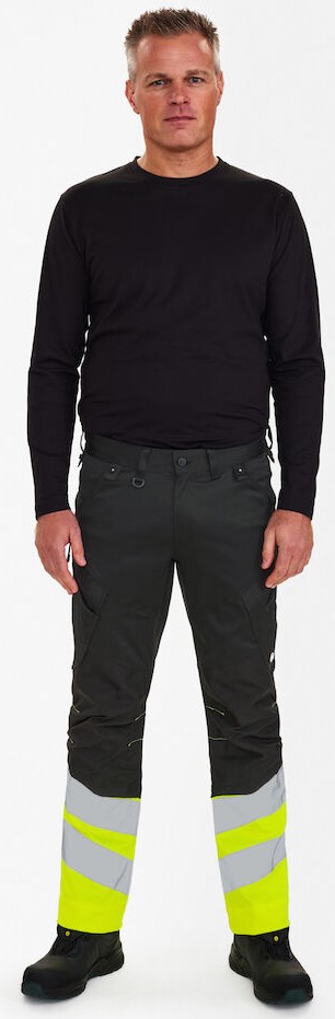 Dehnbare, funktionelle und fluoreszierende Hose im modernen Design. Optimale Passform mit u. a. ergonomisch geformtem Kniebereich. Der dehnbare Stoff sorgt für optimale Bewegungsfreiheit und Komfort. D-Ring vorne für die Befestigung von z. B. Ausweisen. Zwei geräumige Schrägtaschen vorne. Zwei Gesäßtaschen. Zwei Schenkeltaschen mit Reißverschluss. Die linke Schenkeltasche hat eine zusätzliche Handytasche. Die rechte Schenkeltasche hat eine aufgesetzte Zollstocktasche mit zusätzlichen Unterteilungen sowie eine Messertasche, beide Taschen sind verstärkt. Knieverstärkung/Knietasche mit Klettverschluss unten und besteht aus CORDURA®-Material. Reflexstreifen am Unterschenkel. Breiter Saum unten, der ausgelassen werden kann, wenn zusätzliche Beinlänge erforderlich ist. Um die Hose zu verlängern, muss lediglich eine Naht aufgetrennt werden. Das Hosenbein ist trotzdem noch gesäumt. Bekleidungsklasse 1. Nach 50 mal Waschen getestet.