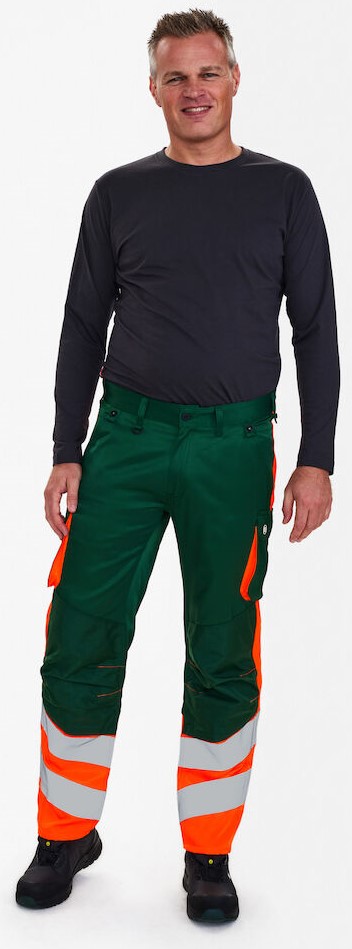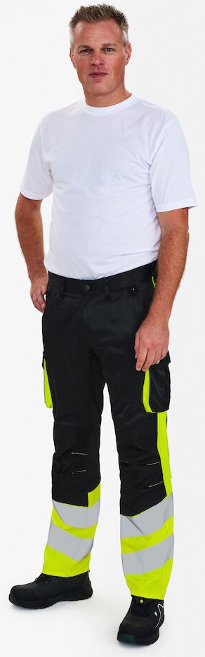 Funktionelle, und fluoreszierende Hose im modernen Design. Optimale Passform mit u. a. ergonomisch geformtem Kniebereich. Der Stoff besteht zu 50% aus, recyceltem Polyester, was zu einer strapazierfähigen und atmungsaktiven Qualität beiträgt. Der elastische Taillenbund hinten sorgt für eine gute Passform und einen sicheren Sitz der Hose. D-Ring vorne für die Befestigung von z. B. Ausweisen. Zwei geräumige Schrägtaschen vorne. Zwei Gesäßtaschen mit Patte und Klettverschluss. Zwei Schenkeltaschen mit Klettverschluss. Die linke Schenkeltasche hat eine zusätzliche Handytasche sowie eine Innentasche, z. B. für das Walkie-Talkie. Die rechte Schenkeltasche hat eine Innentasche für z. B. den Zollstock. Knieverstärkung/Knietasche mit Klettverschluss unten und besteht aus CORDURA®-Material. Reflexstreifen am Unterschenkel. Bekleidungsklasse 1. Nach 50 mal Waschen getestet.