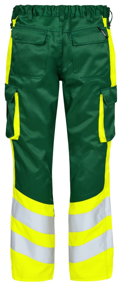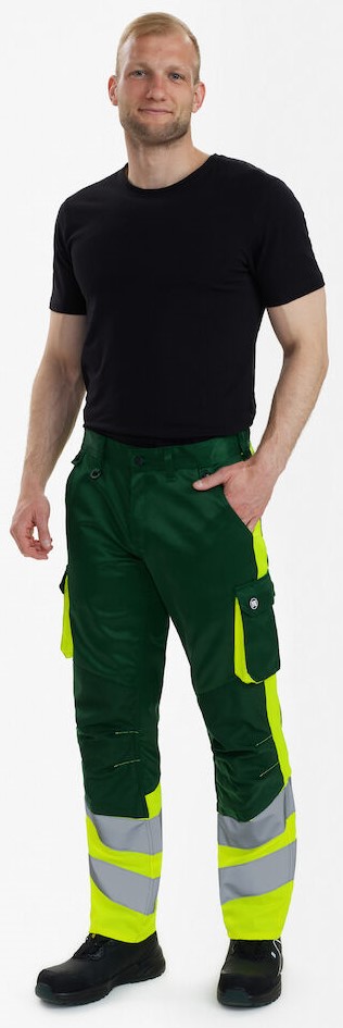 Funktionelle, und fluoreszierende Hose im modernen Design. Optimale Passform mit u. a. ergonomisch geformtem Kniebereich. Der Stoff besteht zu 50% aus, recyceltem Polyester, was zu einer strapazierfähigen und atmungsaktiven Qualität beiträgt. Der elastische Taillenbund hinten sorgt für eine gute Passform und einen sicheren Sitz der Hose. D-Ring vorne für die Befestigung von z. B. Ausweisen. Zwei geräumige Schrägtaschen vorne. Zwei Gesäßtaschen mit Patte und Klettverschluss. Zwei Schenkeltaschen mit Klettverschluss. Die linke Schenkeltasche hat eine zusätzliche Handytasche sowie eine Innentasche, z. B. für das Walkie-Talkie. Die rechte Schenkeltasche hat eine Innentasche für z. B. den Zollstock. Knieverstärkung/Knietasche mit Klettverschluss unten und besteht aus CORDURA®-Material. Reflexstreifen am Unterschenkel. Bekleidungsklasse 1. Nach 50 mal Waschen getestet.