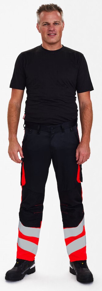 Funktionelle, und fluoreszierende Hose im modernen Design. Optimale Passform mit u. a. ergonomisch geformtem Kniebereich. Der Stoff besteht zu 50% aus, recyceltem Polyester, was zu einer strapazierfähigen und atmungsaktiven Qualität beiträgt. Der elastische Taillenbund hinten sorgt für eine gute Passform und einen sicheren Sitz der Hose. D-Ring vorne für die Befestigung von z. B. Ausweisen. Zwei geräumige Schrägtaschen vorne. Zwei Gesäßtaschen mit Patte und Klettverschluss. Zwei Schenkeltaschen mit Klettverschluss. Die linke Schenkeltasche hat eine zusätzliche Handytasche sowie eine Innentasche, z. B. für das Walkie-Talkie. Die rechte Schenkeltasche hat eine Innentasche für z. B. den Zollstock. Knieverstärkung/Knietasche mit Klettverschluss unten und besteht aus CORDURA®-Material. Reflexstreifen am Unterschenkel. Bekleidungsklasse 1. Nach 50 mal Waschen getestet.