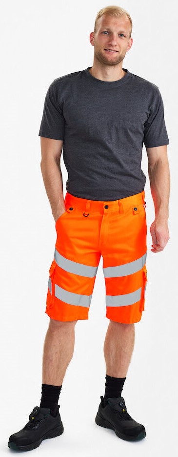 Funktionelle, fluoreszierende Shorts im modernen Design. Der Stoff besteht zu 50% aus recyceltem Polyester, was zu einer strapazierfähigen und atmungsaktiven Qualität beiträgt. Der elastische Taillenbund hinten sorgt für eine gute Passform und einen sicheren Sitz der Shorts. D-Ring vorne für die Befestigung von z. B. Ausweisen. Zwei geräumige Schrägtaschen vorne. Zwei Gesäßtaschen mit Patte und Klettverschluss. Zwei Schenkeltaschen mit Klettverschluss. Die linke Schenkeltasche hat eine zusätzliche Handytasche sowie eine Innentasche, z. B. für das Walkie-Talkie. Die rechte Schenkeltasche hat eine Innentasche für z. B. den Zollstock. Reflexstreifen am Schenkel. Bekleidungsklasse 1. Nach 50 mal Waschen getestet.
