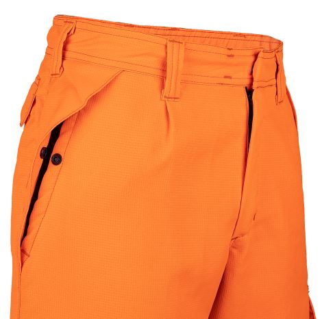 Außen: verdeckter Knopfverschluss / Vorderschlitz mit Reißverschluss, 2 eingesetzte Taschen mit Patten und Druckknopfverschluss, 1 aufgesetzte Oberschenkeltasche mit Verstärkung und Patte, sowie verdeckten Druckknöpfen, 1 aufgesetzte Gesäßtasche mit Patte und verdeckten Druckknöpfen, Knietaschen für Polster, Bund mit Gürtelschlaufen, doppelt genähte (2x2) flammenhemmende Reflexstreifen (70mm)