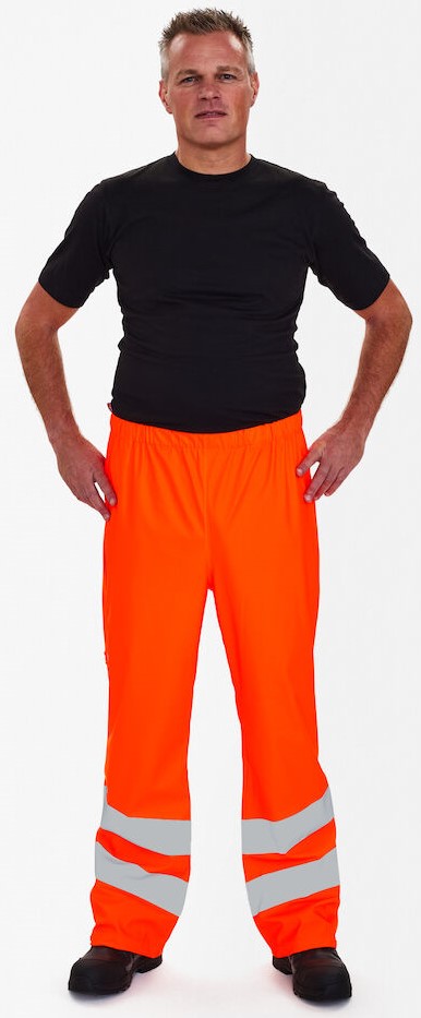 Funktionelle Regenhose mit verschweißten Nähten. Verstellbarer Gummizug in der Taille. Funktionelle Zollstocktasche. Verstellbare Beinweite an den Hosenbeinabschlüssen. Bekleidungsklasse 2. Getestet nach 5 Wäschen
