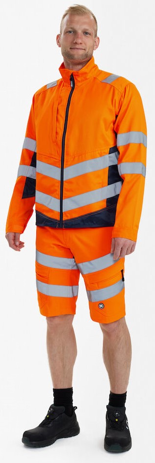Funktionelle fluoreszierende Arbeitsjacke im modernen Design. Die Jacke hat einen hohen Kragen und ist hinten länger geschnitten. Reißverschluss vorne. Der Stoff ist strapazierfähig und atmungsaktiv. Er besteht zu 50% aus recyceltem Polyester. Zwei geräumige Seitentaschen sowie eine Brusttasche, jeweils mit Reißverschluss. Verstellbare Manschetten. Verdeckter D-Ring für die Befestigung von z. B. Ausweisen. Reflexstreifen über die Schulterpartie hinweg sowie rund um Ärmel und Taille. Bekleidungsklasse 2. Nach 50 mal Waschen getestet.