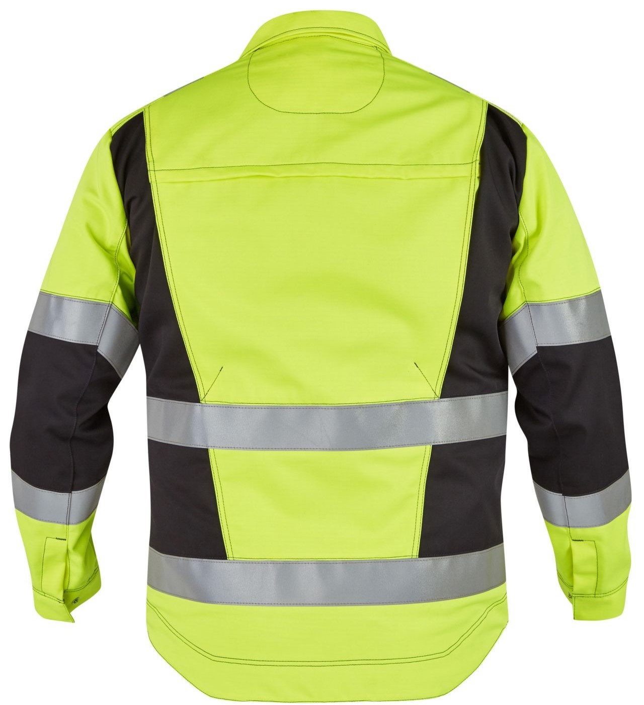 Die ROFA VIS-LINE II Jacke aus flammhemmendem Proban®Gewebe bietet hohen Schutz bei Gefährdung durch Hitze und Flammen und eignet sich besonders bei Arbeiten bei denen eine hohe Sichtbarkeit gefordert wird. Die Jacke schützt zudem bei Schweißarbeiten und bei Gefährdung durch die thermischen Gefahren eines elektrischen Lichtbogens. Dazu besitzt die Jacke elektrostatisch ableitfähige Eigenschaften und schützt vor kleinen Mengen versprühter oder verspritzter Chemikalien. Die Ärmel mit extra Hebelänge und weitenverstellbarem Ärmelabschluss, der verlängerte Rücken und die Bewegungsfalten im Rücken schaffen viel Bewegungsfreiheit und ein besonders angenehmes Tragegefühl. Reflexstreifen und -paspeln am Vorder- und Rückenteil sorgen für ein dynamisches Erscheinungsbild und optimale Sichtbarkeit.