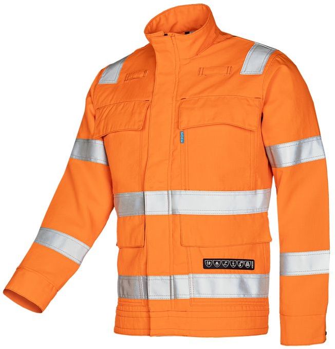 Ingon ist eine praktische Jacke und ist aus einem inhärent flammenhemmenden Stoff gefertigt, der einen sehr guten Schutz gegen schwere Verbrennungen bietet, die durch Hitze, Flammen oder Lichtbögen verursacht werden können. Die Jacke entspricht der Norm EN ISO 20471, Klasse 3, für Warnschutzbekleidung. Aufgrund der fluoreszierenden Farbe leuchtorange und des retroreflektierenden Materials entspricht die Jacke auch dem RIS-3279-TOM-Standard. Dies ist ein Standard für Warnschutzbekleidung, der in der britischen Eisenbahnindustrie vorgeschrieben wird, um die Sichtbarkeit von Personen auf und um die Bahnstrecken zu verbessern.+