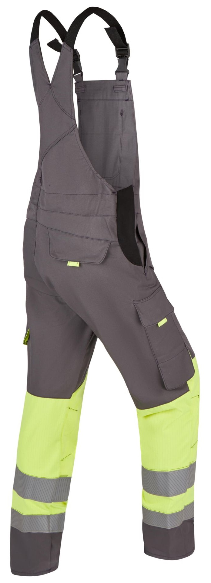 Ausführung: Stretchträger, Latztasche mit Patte, Schlitz mit Reißverschluss, Bund seitlich mit Dehneinsatz, 2 Seitentaschen, links Cargotasche mit aufgesetzter Smartphonetasche mit Patte und Klett, rechts Zollstocktasche mit Patte, Knietaschen mit Einschubfalte, rechts Gesäßtasche mit Patte, Patten mit Kunststoffdruckknöpfen, 50 mm und 70 mm Reflexstreifen um Beine