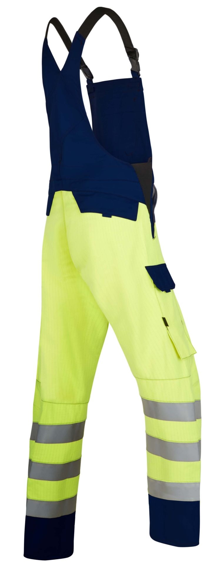 Stretchträger • Latztasche mit Patte • Schlitz mit Reißverschluss • Bund seitlich mit Dehneinsatz • 2 Seitentaschen • links Cargotasche mit aufgesetzter Smartphonetasche jeweils mit Patte • rechts Zollstocktasche mit Patte • 2 Gesäßtaschen mit Patte • alle Patten mit Druckknöpfen • einfache Hosenbeinverlängerung durch skandinavischen Saum • 70 mm Reflexstreifen um Beine • Reflexpaspel an Latz