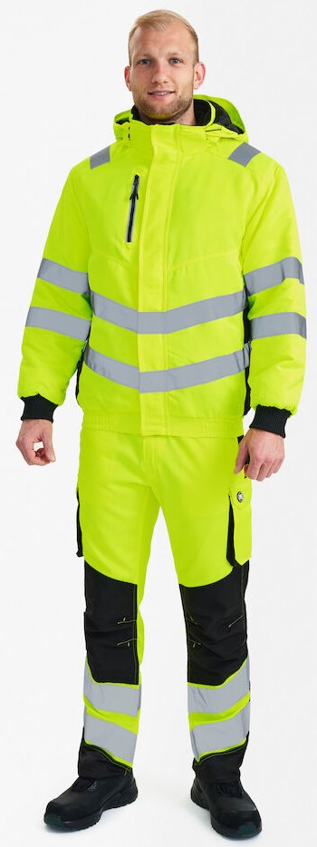 Fluoreszierende, wind- und wasserabweisende Pilotenjacke mit modernem Schnitt. Hoher Kragen mit Fleece innen. Doppelte Knopfleiste mit Reißverschluss sowie Klettverschluss vorne. Zwei geräumige Seitentaschen sowie Brusttasche mit Reißverschluss. Zwei Innentaschen, eine davon mit Reißverschluss. Abnehmbare, verstellbare Kapuze mit ausreichend Platz für den Arbeitshelm. Elastischer Saum unten und Rippstrick am Ärmelabschluss. Reißverschluss im Futter, der sich für Aufdruck/Stickerei eignet. Reflexstreifen über der Schulterpartie sowie rund um Ärmel und Taille. Bekleidungsklasse 3. Getestet nach 50 Wäschen.