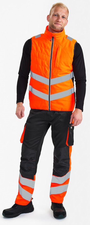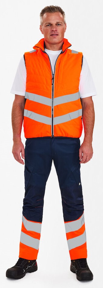 Warme, fluoreszierende Weste im modernen Design mit wind- und wasserabweisenden Eigenschaften. Die Weste kann mit den Modellen 1146-930 kombiniert werden, die einen Reißverschluss zum Einzippen haben. Reflektierender Reißverschluss vorne. Zwei Seitentaschen sowie Brusttasche mit Reißverschluss. Die Weste hat unten und am Armloch ein elastisches Bündchen. Reflexstreifen über die Schulterpartie hinweg sowie rund um die Taille. Bekleidungsklasse 1. Nach 50 mal Waschen getestet.