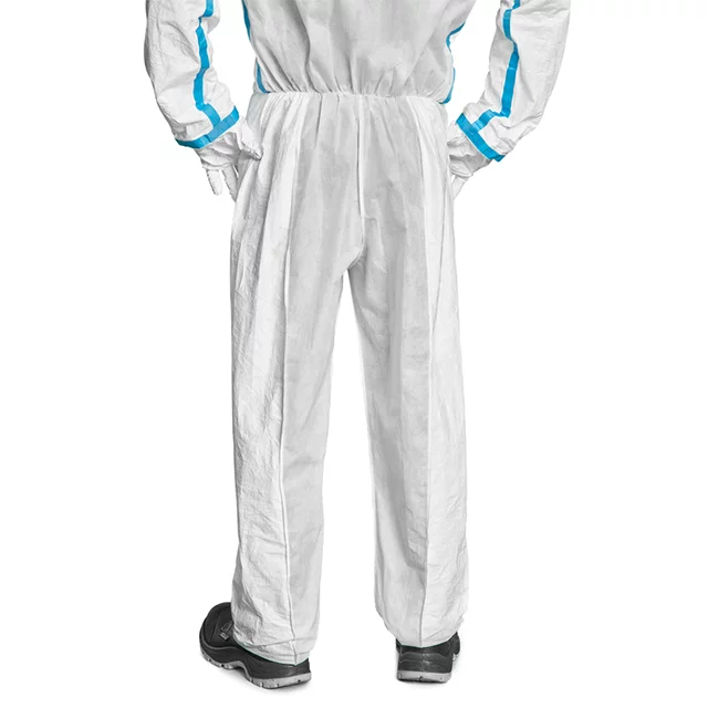 DuPont™ Tyvek® 400 Dual TG. Anzug mit Kapuze. Vorderseite aus Tyvek®, großer atmungsaktiver Einsatz aus SMS im Rückenbereich. Gesteppte Nähte, am Oberkörper zusätzlich überklebt: Unterarme und Handgelenke, an denen Tyvek® Innenhandschuhe befestigt sind. Angearbeitete Socken aus Tyvek®. Kapuze mit Gummizug. Gummizug in der Taille (eingenäht). Tyvek® Reißverschluss und Abdeckung. Kinnabdeckung mit Klebeband. Weiß.