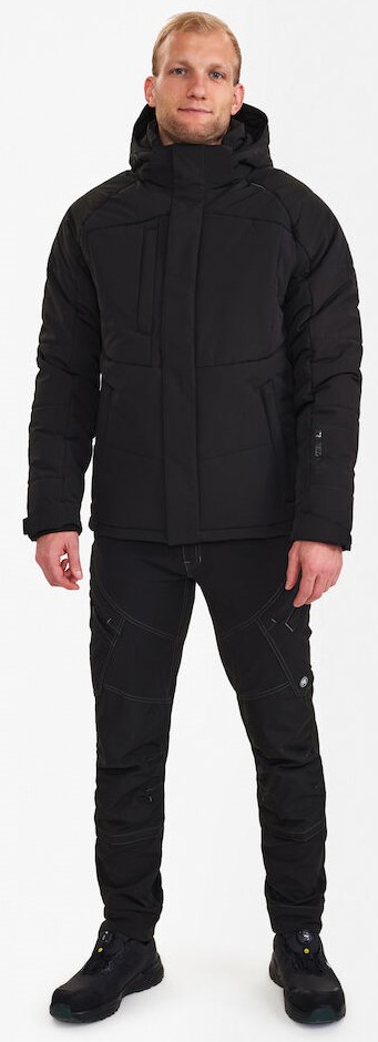 Smart, stylish pilot jacket made from stretchy material that increases comfort and freedom of movement. The jacket with wide quilted inserts for increased thermal insulation is wind and water repellent. The soft inner collar is comfortable against the skin and protects against the wind. Concealed zipper with press studs at the front. Two side pockets and chest pocket with zipper. Two inside pockets with Velcro fastener. The jacket has a detachable, adjustable hood and an elasticated rib-knit insert at the back for increased wind protection. The adjustable sleeves have a rib-knit wind cuff. Reflective piping for better visibility.