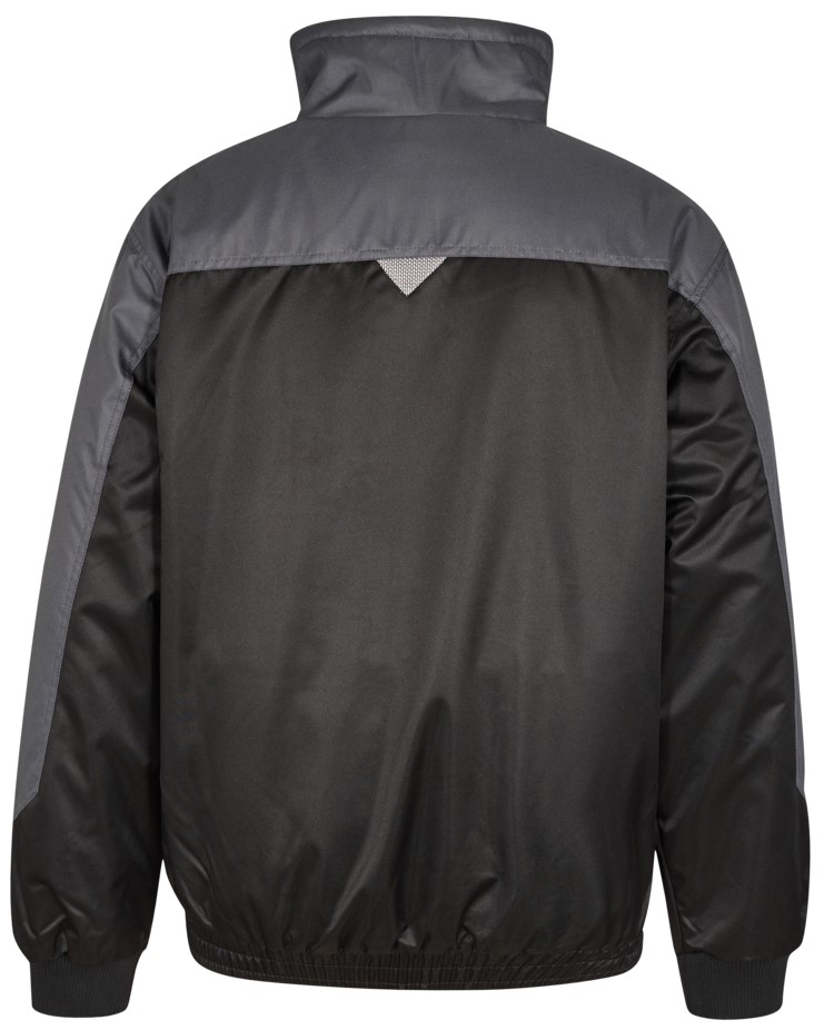 Two-tone pilot jacket with double concealed plastic zipper in matching color design. Reinforced shoulders and sleeves. Dark-colored press studs. Left breast pocket with side access with zipper. Open breast pocket with closable cell phone pocket on the right. Two side pockets. Inner pocket with zipper. Knitted cuffs on the sleeves. Elasticated waistband. Adjustable collar with cord stopper. Fiber fur in the collar and on the body. Zipper at the lower back to make the jacket easier to handle for transfers or emblems. Wind and water-repellent material.
