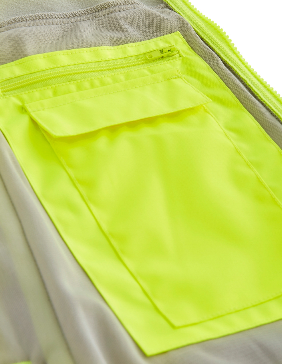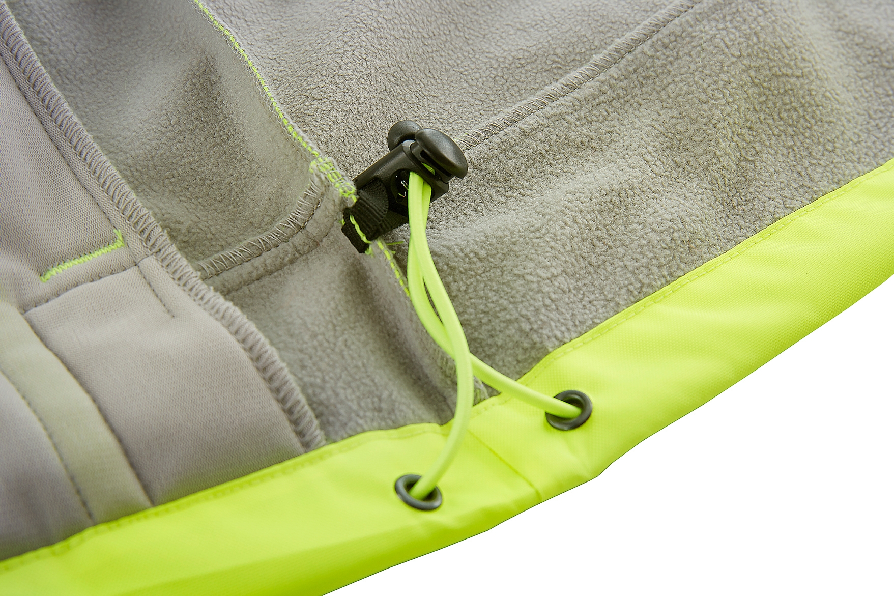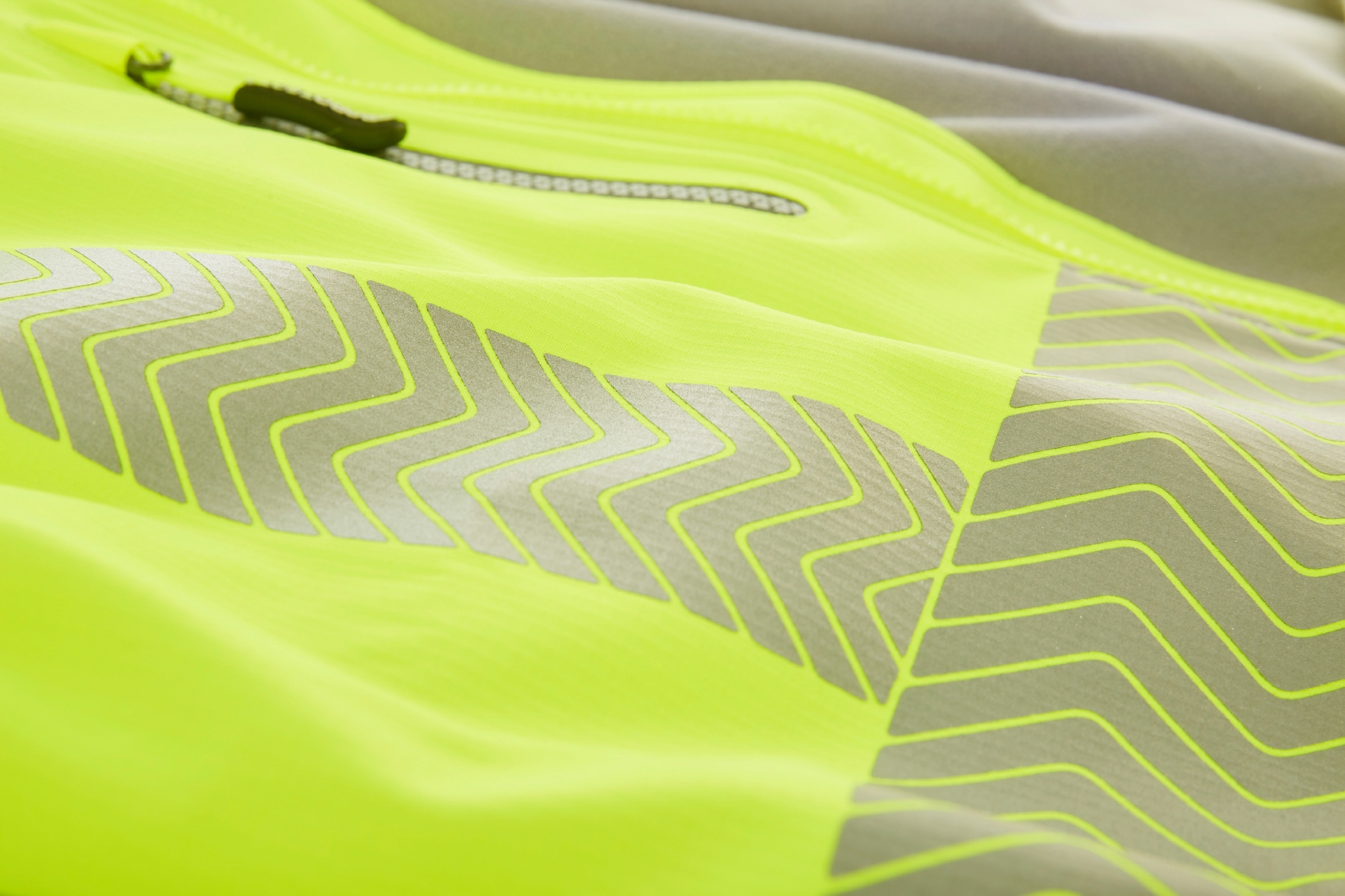 Comfortable to wear thanks to the combination of elastic fabric with a close-fitting cut. The integrated functional membrane guarantees a high level of waterproofnesswith good breathability of the fabric. The warming fleece lining protects the body from cooling down. The ripstop fabric is particularly tear-resistant and prevents further tearing in the event of small tears. Directly attached segmented reflective strips run around the body and shoulders and ensure a high level of safety and visibility.1 underlaid front zipper with chin guard. 1 chest pocket with waterproof reflective zipper, 2 lower covered zipper pockets. Drawstring hem, armholes with elasticated cuffs and high, fleece-lined collar. Elaborate interior finish with large inside pocket and cell phone pocket.