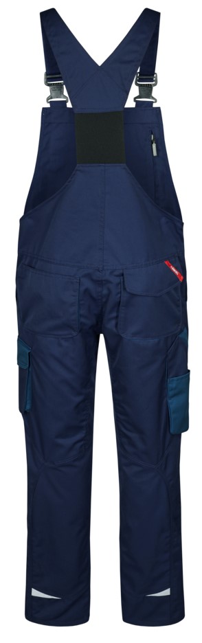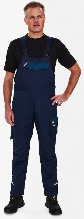Functional dungarees with many details. Optimum fit, including ergonomically shaped knees and panel on the inseam in the crotch for greater comfort. Wide, elasticated back section and adjustable straps. Outer pocket in the bib with additional slot for pens. There is a loop with a D-ring under the pocket flap for attaching an ID card. Large zippered pocket on the back of the flap. Two spacious, slanted slit pockets at the front. Two spacious back pockets, the right one with flap and Velcro fastener. Large thigh pocket with zipper pocket for cell phone, additional small pocket. Folding rule pocket with additional compartments. The ruler pocket has a free-hanging bottom. Reflective strips at the bottom of the trouser legs for increased visibility. Suitable for industrial laundering.