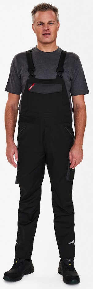 Functional dungarees with many details. Optimum fit, including ergonomically shaped knees and panel on the inseam in the crotch for greater comfort. Wide, elasticated back section and adjustable straps. Outer pocket in the bib with additional slot for pens. There is a loop with a D-ring under the pocket flap for attaching an ID card. Large zippered pocket on the back of the flap. Two spacious, slanted slit pockets at the front. Two spacious back pockets, the right one with flap and Velcro fastener. Large thigh pocket with zipper pocket for cell phone, additional small pocket. Folding rule pocket with additional compartments. The ruler pocket has a free-hanging bottom. Reflective strips at the bottom of the trouser legs for increased visibility. Suitable for industrial laundering.