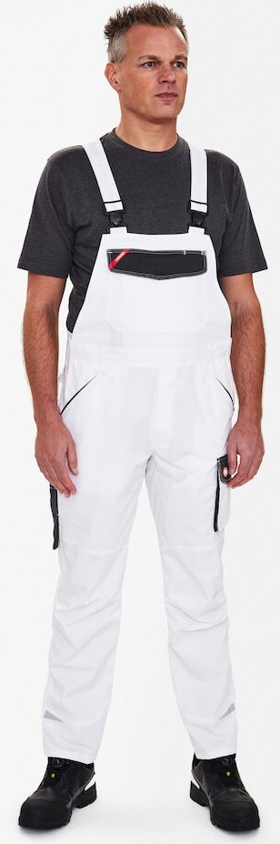 Functional dungarees with many details. Optimum fit, including ergonomically shaped knees and panel on the inseam in the crotch for greater comfort. Wide, elasticated back section and adjustable straps. Outer pocket in the bib with additional slot for pens. There is a loop with a D-ring under the pocket flap for attaching an ID card. Large zippered pocket on the back of the flap. Two spacious, slanted slit pockets at the front. Two spacious back pockets, the right one with flap and Velcro fastener. Large thigh pocket with zipper pocket for cell phone, additional small pocket. Folding rule pocket with additional compartments. The ruler pocket has a free-hanging bottom. Reflective strips at the bottom of the trouser legs for increased visibility. Suitable for industrial laundering.