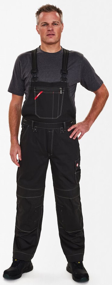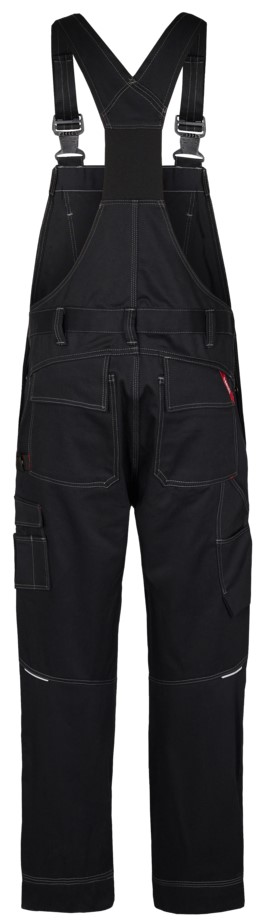 Functional dungarees with contrasting topstitching. High-cut back with wide elasticated waistband and adjustable straps. Chest pocket with compartments for pens and chest pocket with zipper. Optimum fit, ergonomically shaped knees. Adjustable waist size. Two spacious, slanted slit pockets at the front. Two back pockets with flap. Thigh pocket with flap and inserts for pens, for example. Free-hanging, reinforced folding rule pocket with extra compartments guarantees optimum freedom of movement. Adjustable hammer loop. Reinforced knee pocket with two adjustment options for knee pads. Reinforced hem on trouser legs for extra wear resistance. High visibility thanks to reflective piping in the middle of the back of the trouser legs. The trouser legs have an extra wide turn-up so that the inseam can be extended if required. For an extra-long leg length, simply open one hem, which conceals an additional hem.