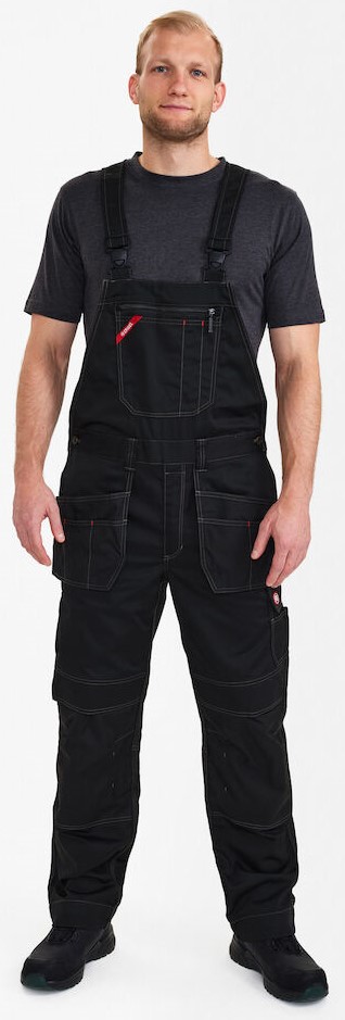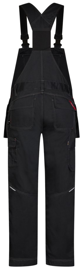 Functional dungarees with contrasting topstitching. High-cut back with wide elasticated waistband and adjustable straps. Chest pocket with compartments for pens and chest pocket with zipper. Optimum fit, ergonomically shaped knees. Adjustable waist size. Two spacious, slanted pockets. Slit pockets and two front holster pockets. Two back pockets with flap. Thigh pocket with flap and inserts for pens, for example. Free-hanging, reinforced folding rule pocket with extra compartments guarantees optimum freedom of movement. Adjustable hammer loop. Reinforced knee pocket with two adjustment options for knee pads. Reinforced hem on trouser legs for extra wear resistance. High visibility thanks to reflective piping in the middle of the back of the trouser legs. The trouser legs have an extra wide turn-up so that the inseam can be extended if required. For an extra-long leg length, simply open one hem, which conceals an additional hem.