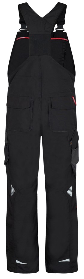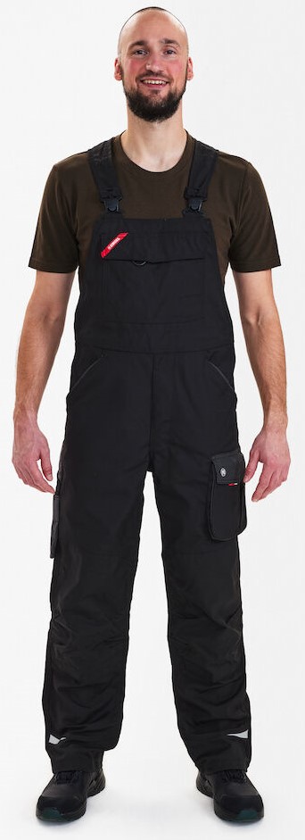 Functional dungarees with many details. Optimum fit, including ergonomically shaped knees and panel on the inseam in the crotch for greater comfort. Wide, elasticated back section and adjustable straps. Outer pocket in the bib with additional slot for pens. There is a loop with a D-ring under the pocket flap for attaching an ID card. Large zippered pocket on the back of the flap. Two spacious, slanted slit pockets at the front. Two spacious back pockets with flap and Velcro fastener. Large thigh pocket with zippered pocket for cell phone, additional small pocket with free-hanging bottom for greater freedom of movement. Reinforced ruler pocket at the bottom with additional compartments. The ruler pocket also has a free-hanging bottom. Knee reinforcement/knee pocket with Velcro fastener at the bottom and two adjustment options for knee pads. Reinforced hem at the back and front of the trouser legs for extra wear resistance. Reflective strips on the knees and at the bottom of the trouser
