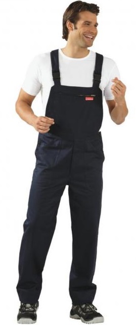 Bib with concealed brass zipper, 2 reinforced front patch pockets, 1 reinforced back pocket, 1 ruler pocket, adjustable side slits with access, buttoned fly, raised back, braces with rubber insert, safety buckles on the straps.