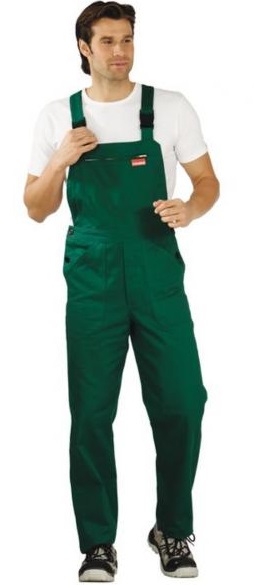 Bib with concealed brass zipper, 2 reinforced front patch pockets, 1 reinforced back pocket, 1 ruler pocket, adjustable side slits with access, buttoned fly, raised back, braces with rubber insert, safety buckles on the straps.