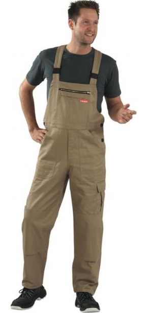 Comfortable cut, complete equipment! This article, in conjunction with a knee PLANAMpad (Art. No. 9901027), is certified as knee protection according to EN 14404 Type 2, Level 1. Bib with brass zipper, additional patch bib pocket, 2 reinforced patch front pockets, 1 back pocket and 1 ruler pocket with adjustable side slits, thigh pocket left, knee pad pocket, fly with zipper, raised back with solidly constructed elastic intermediate part, safety buckles on the straps.