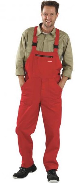 Bib with brass zip, additional patch bib pocket, 2 reinforced patch front pockets, 1 back pocket, 1 ruler pocket, adjustable side slits, fly with zip, raised back with solidly constructed elastic intermediate part, safety buckles on the straps.