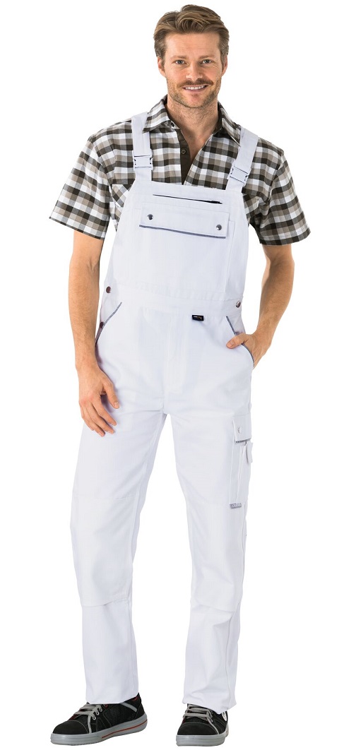 This article, in conjunction with a knee PLANAMpad (Art. No. 9901027), is certified as knee protection according to EN 14404 Type 2, Level 1. Knee pockets made of Cordura®, 2 set-in pouch pockets made of Cordura®, double ruler pocket made of Cordura® on the right, reflective piping on pocket openings and pocket flaps, thigh pocket on the left with flap and press studs, mobile phone pocket on top, double bib pocket, 1 with flap and press studs and 1 with zip, elasticated waistband, 1 reinforced hip pocket on the right, waistband width adjustment with jeans button, zip in trouser fly, raised back with cross straps, straps with elasticated elastic band insert, safety buckle on the straps.