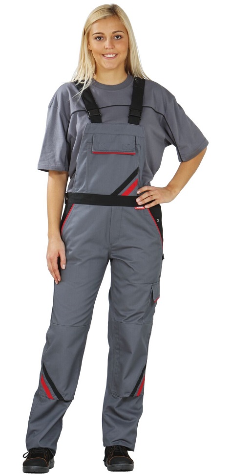 This article is certified as knee protection according to EN 14404 type 2, level 1 in combination with a knee PLANAMpad (art. no. 9901027). 2 set-in pouch pockets, 2 patch knee pockets with coloured applications, double ruler pocket, left thigh pocket with flap and Velcro closure, bib pocket with flap and Velcro closure, coloured applications on bib pocket, elasticated waistband, 2 hip pockets with flaps, waist width adjustment with concealed press stud, raised back with cross straps, straps with elastic elastic band insert, safety buckle on the straps, pocket openings and pocket flaps with coloured piping.
