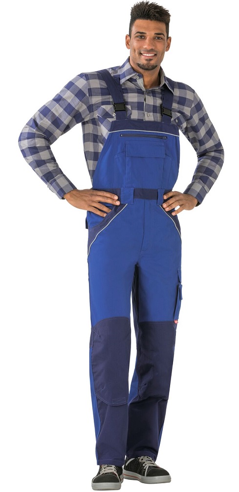 This article, in conjunction with a knee PLANAMpad (Art. No. 9901027), is certified as knee protection according to EN 14404 Type 2, Level 1. 2 set-in pouch pockets, 2 patch knee pockets, double ruler pocket on the right, thigh pocket on the left with flap and Velcro fastener, mobile phone pocket on the left, bib pocket with flap and Velcro fastener, further bib pocket with zip, 2 pen compartments, elasticated waistband, 2 hip pockets with flaps and Velcro fastener, waist width adjustment with jeans button, zipper in trouser fly, raised back with cross straps, straps with elastic elastic band insert, safety buckle on the straps, reflective piping as safety equipment.