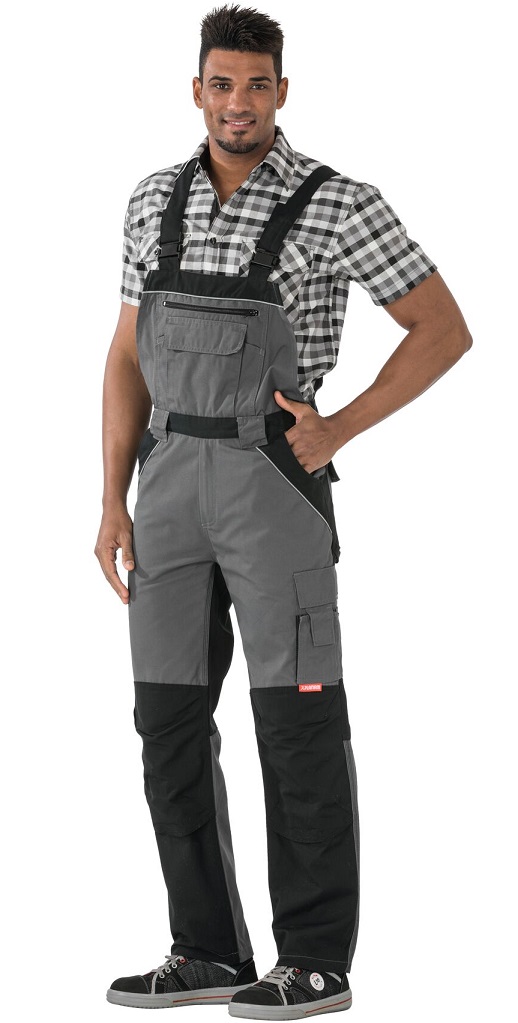 This article, in conjunction with a knee PLANAMpad (Art. No. 9901027), is certified as knee protection according to EN 14404 Type 2, Level 1. 2 set-in pouch pockets, 2 patch knee pockets, double ruler pocket on the right, thigh pocket on the left with flap and Velcro fastener, mobile phone pocket on the left, bib pocket with flap and Velcro fastener, further bib pocket with zip, 2 pen compartments, elasticated waistband, 2 hip pockets with flaps and Velcro fastener, waist width adjustment with jeans button, zipper in trouser fly, raised back with cross straps, straps with elastic elastic band insert, safety buckle on the straps, reflective piping as safety equipment.