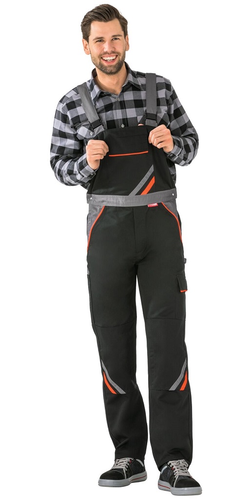 This article is certified in combination with a knee PLANAMpad (Art.-No. 9901027) as knee protection according to EN 14404 Type 2, Level 1. 2 set-in pouch pockets, 2 patch knee pockets with coloured applications, double ruler pocket, left thigh pocket with flap and Velcro closure, mobile phone pocket, bib pocket with flap and Velcro closure, coloured applications on bib pocket, elasticated waistband, 2 hip pockets with flaps, waist width adjustment with concealed press stud, zip in trouser fly, raised back with cross straps, straps with elastic band insert, safety buckle on the straps, pocket openings and pocket flaps with coloured piping.